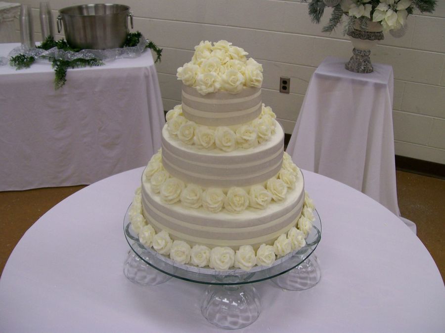 This cake I only had 2 weeks notice for, it was relatively simple stacked 14",10"& 6" with 3 rows of silver ribbon around each layer with buttercream roses around each layer and topper. I made 125 buttercream roses but only used around 95, just wanted to have extras.