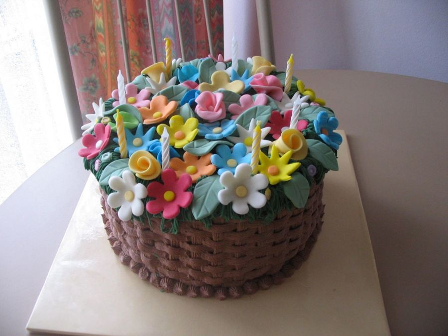 I made this cake for my cousins birthday.She loved it and didn't want to cut it. Its 2 x 8" chocolate cakes with cookies and cream filling. Its has chocolate buttercream basket weave and all the flowers are made from MMF. The candles are real.The buttercream ended up with small air bubbles in it but other than that it turned out pretty good. I got ideas from a few other CC members and want to thank them.