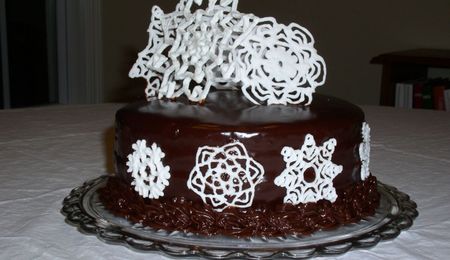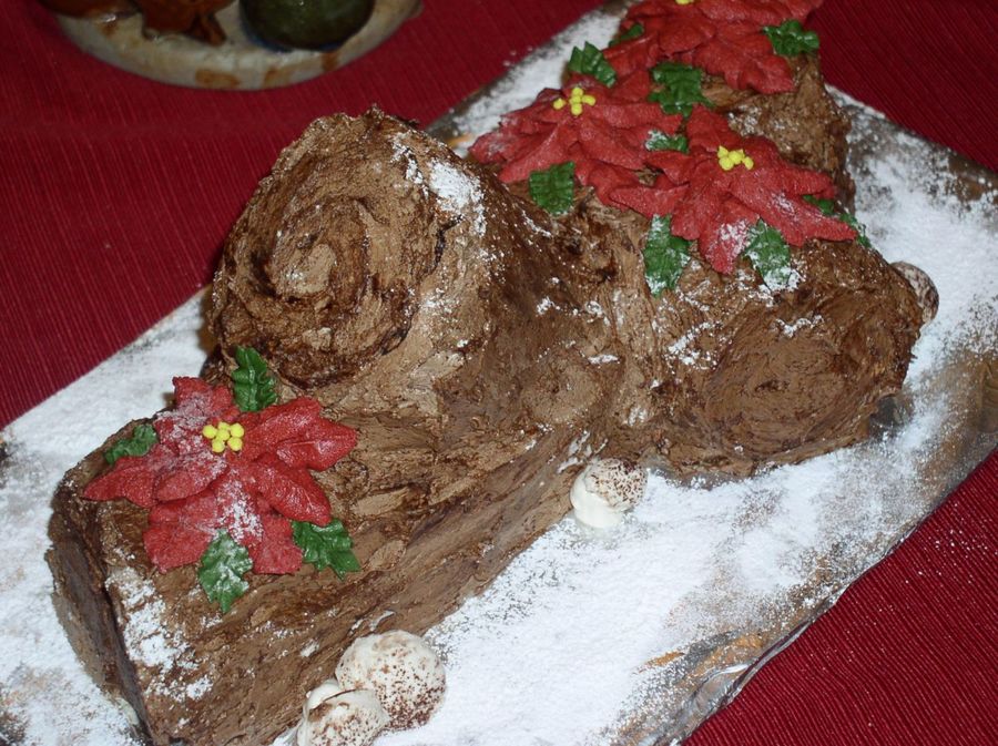 This is my yule log. Thanks to CC for all the help. It was chocolate genoise with coffee smbc filling and choc. smbc frosting. I used buttercream dream for the poinsettias and mushrooms. I forgot to stiffen the bc for mushrooms so they flopped a little.