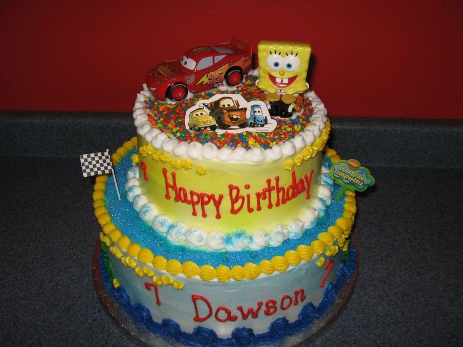 My son couldn't decide if he wanted SpongeBob or Cars...so I tried to tie them both in. He loved his cake! It is all buttercream. The bottom teir is vanilla and the top is cinnamon coffee cake.