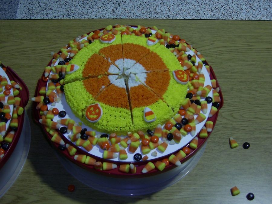 If you'd like to see the inside, go to the gallery and search for "Candy Corn" There are several examples of this cake that other people have posted where the inside is shown. It's really cute - each slice looks just like a piece of candy corn!