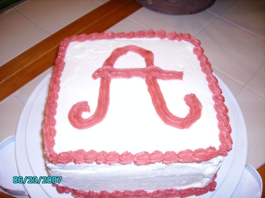 This cake was made for a co-workers birhday. Her name starts with an A and she is a big Alabama fan . It was a lemon cake with raspberry filling an d cream cheese icing- all recipes found here- thanks!!