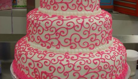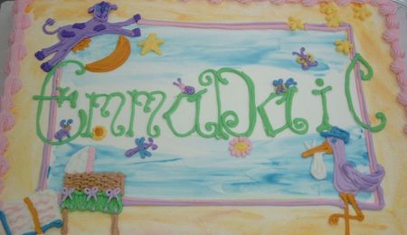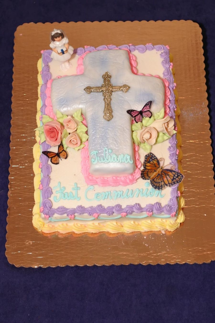 1/2 sheet with cot out cross shape covered in fondant. Roses made from chocolate paste and butterflies are rice paper pre-printed.