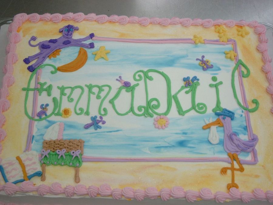 LukeRubyJoy on 28 Dec 2006 , 5:39am This is very inventive, btw, what is the babies name? Emma Daic?? Sorry I'm impaired!!! Great Stork and other piped figures...really nice job.