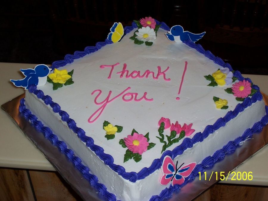 White cake with BC icing and royal icing flowers with color flow decorations. I threw this one together fast for a reception at our school for Education appreciation week.