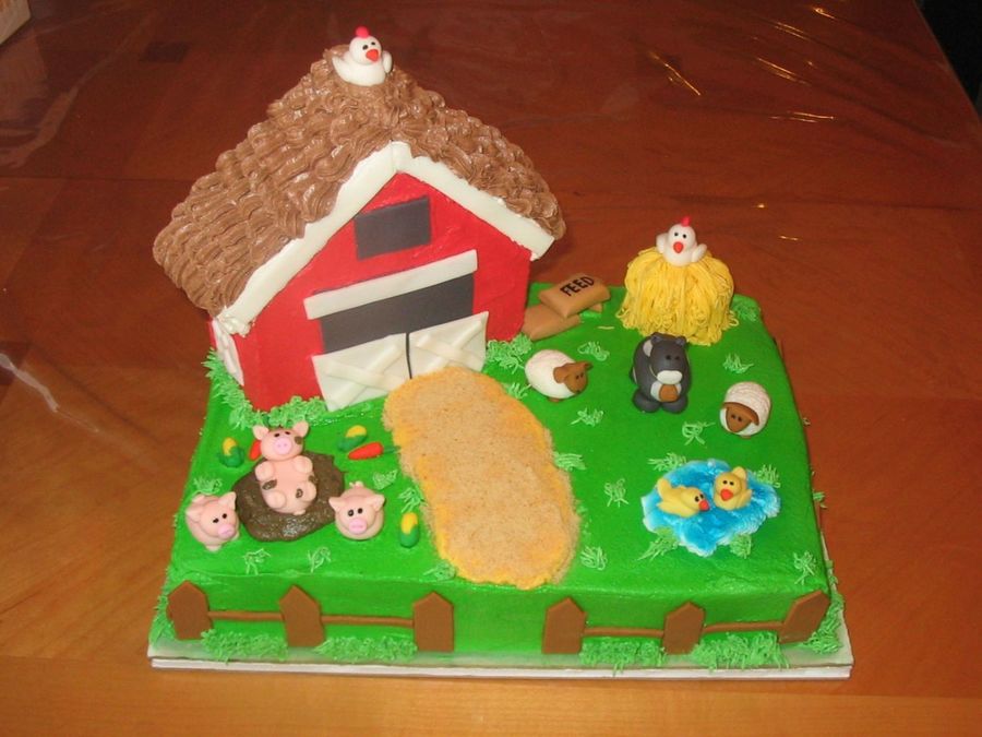 I have been dying to do a barn cake for a long time now so I decided to make it the theme for my sons 2nd birthday just so I could do it. ;) I used the Wilton house pan for the barn and a 9x13 for the base. It is a yellow cake with BC and fondant accents. I took a few ideas from cake I saw by CustomCakesBySharon, DianeLM and mariak, THANKS!