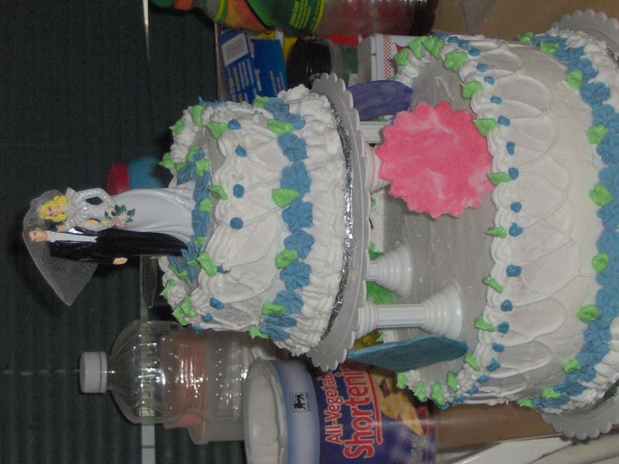 first wedding cake covered in buttercream and royal icing flowers with fondant cutouts of a moon,star,sun,and flower