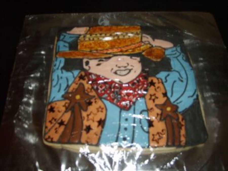 I fixed the cowboys arms....I think he looks a little less freaky now. I went ahead and entered him in the fair. This is a sugar cookie with royal icing. The stars and bandana details are drawn in with a toothpick and americolor gels. ( I don't have food writer pens yet! )