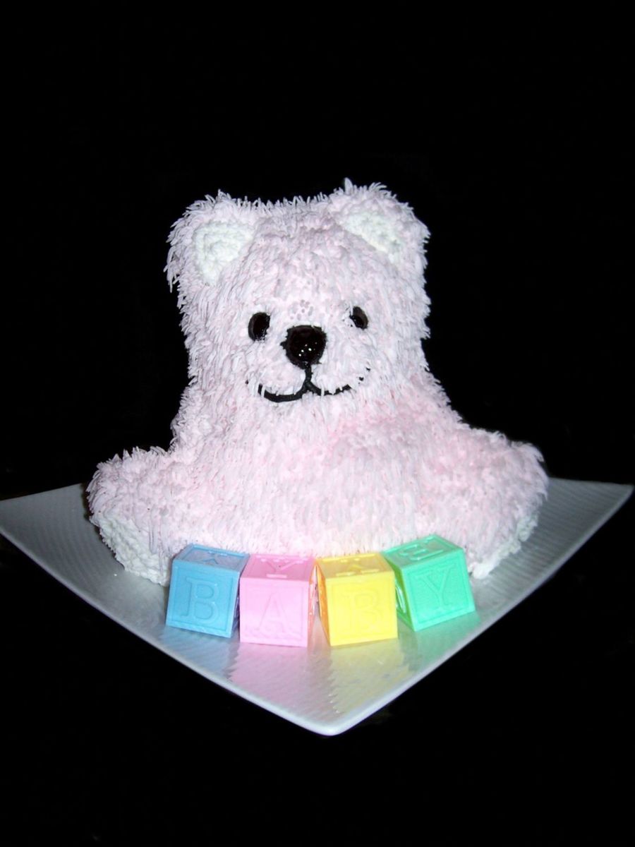 Wilton's stand up teddy bear. Poundcake with IMBC. Eyes and nose are covered with piping gel to look "wet."