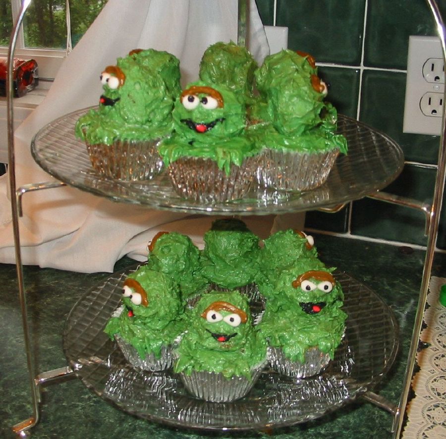 I made these Oscar cup cakes for my son's 1st birthday party. The head is a marzipan cookie with green buttercream icing.