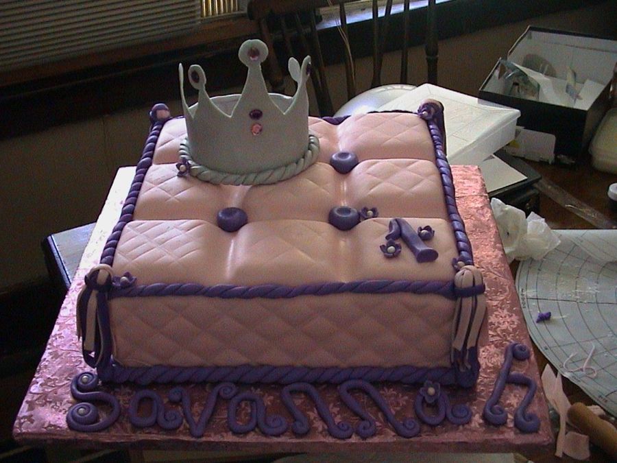 This vanilla w/ vanilla buttercream frosting & whipped cream filling cake was done for a princess themed birthday party. All decorations are MMF except for the jewels on the crown. Please excuse my mess in the background. I was so pleased with the way this turned out that I couldn't wait to take a picture!