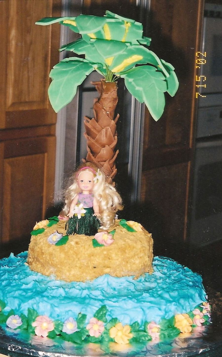This palm tree was my very first attempt at anything with fondant. I've learned many things since making this cake that would make it much easier. This is decorated in BC with royal flowers on sides and graham crackers for sand. Made the hula outfit for doll too. Thanks for looking
