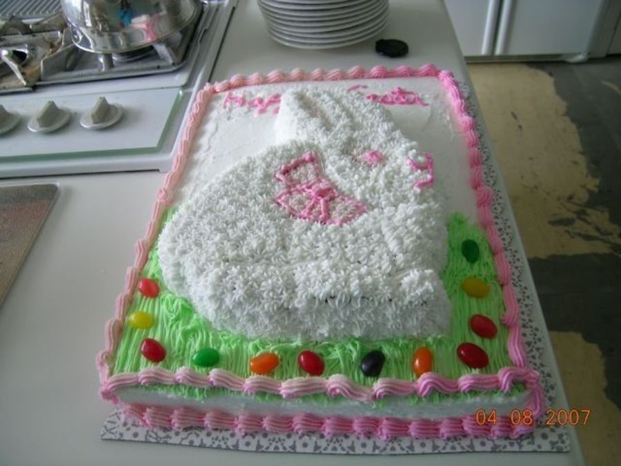 Easter cake made for family. Vanilla bunny, chocolate sheet. All buttercream. Left it out in the sun too long and the colors started to fade, but everyone liked it anyway!