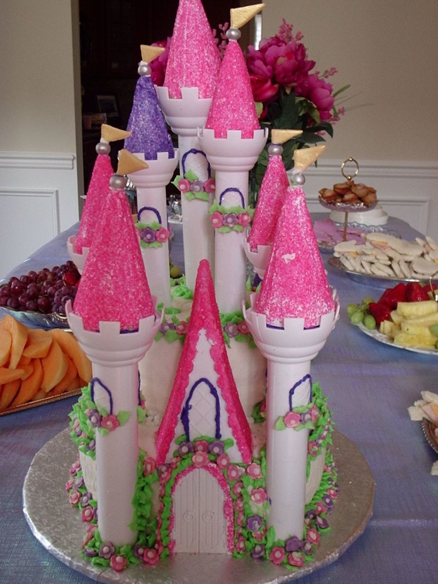 Princess castle cake for a 5 and 9 year old princess tea party! This cake looked alot better. it fell apart on the way to the party and I had to repair it at the party.