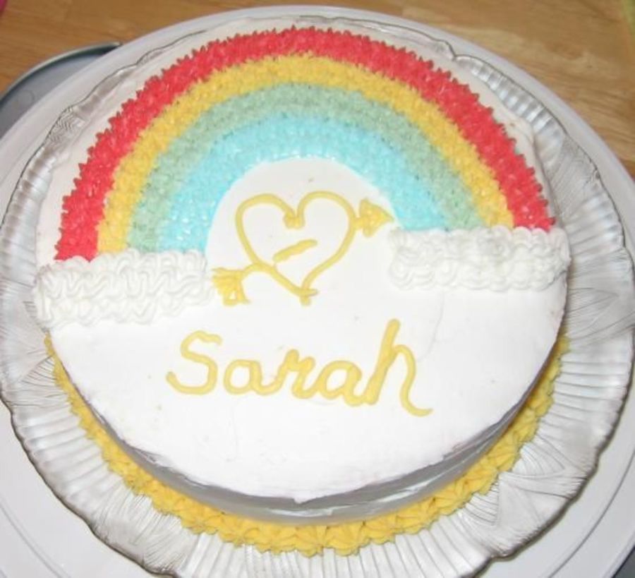 JaneK on 5 Jan 2007 , 2:59am I think the heart and writing is cute!! This makes the rainbow cake so much more original!!! :)