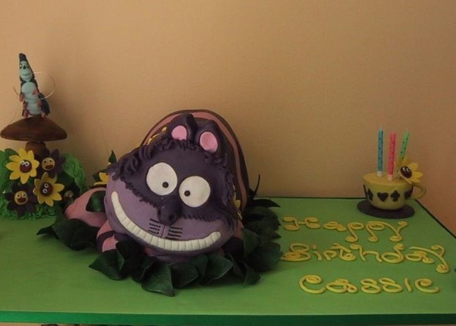 3D CHeshire Cat. Cake was Lemon Coconut filled with cream cheese buttercream. Cake coverd in fondant, catapilla, leaves etc were made from modelling paste.