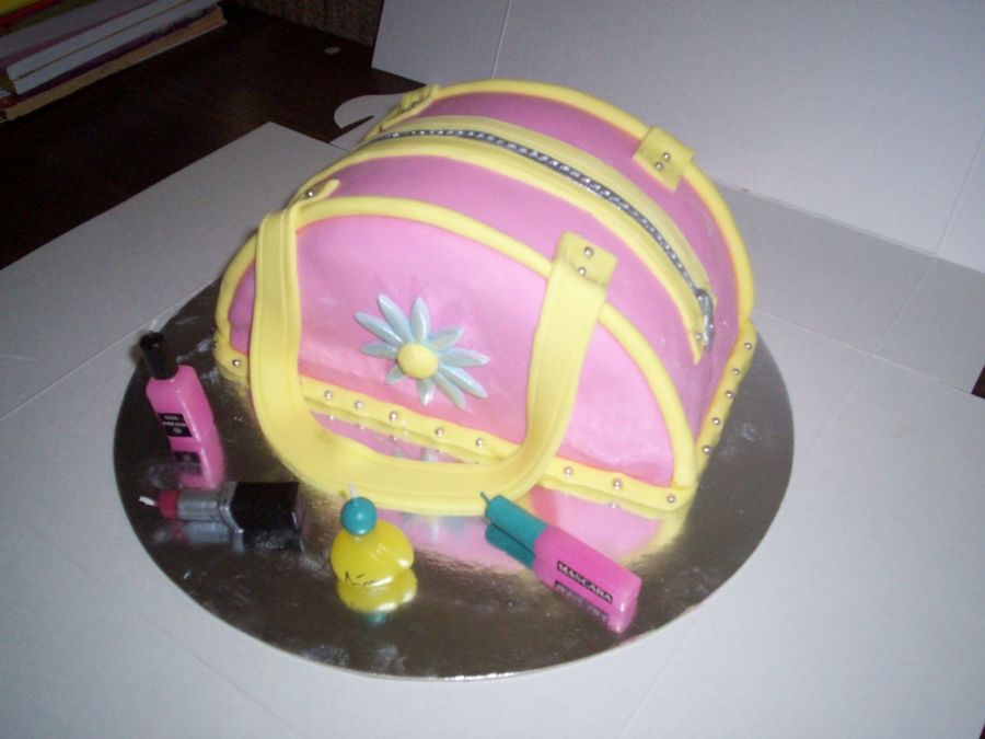 20cm round butter cake cut in half and placed side by side to get the bag shape. First iced in butter cream and then covered with fondant. All accents are fondant. Make up are novelty candles.