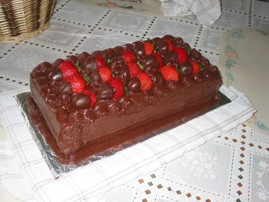 Chocolate cake, whipped chocolate filling, chocolate buttercream frosting and chocolate dipped strawberries...oh my!