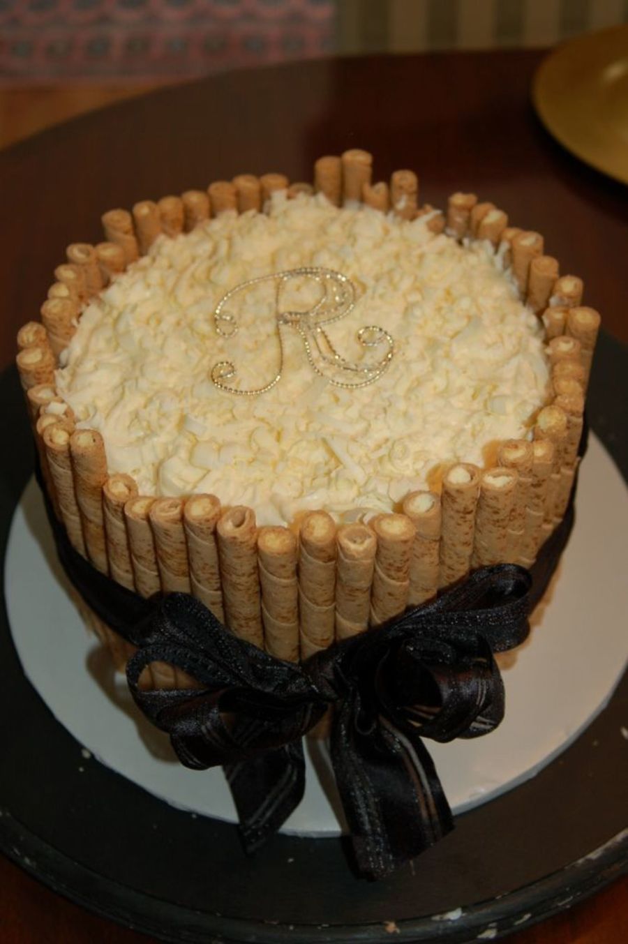 White choc sour cream cake with strawberry filling, cream cheese frosting, and surrounded by pirouettes. Added the pretty "R" (puchased from Target after Xmas last year - they were gift tags) on top of shaved white chocolate.