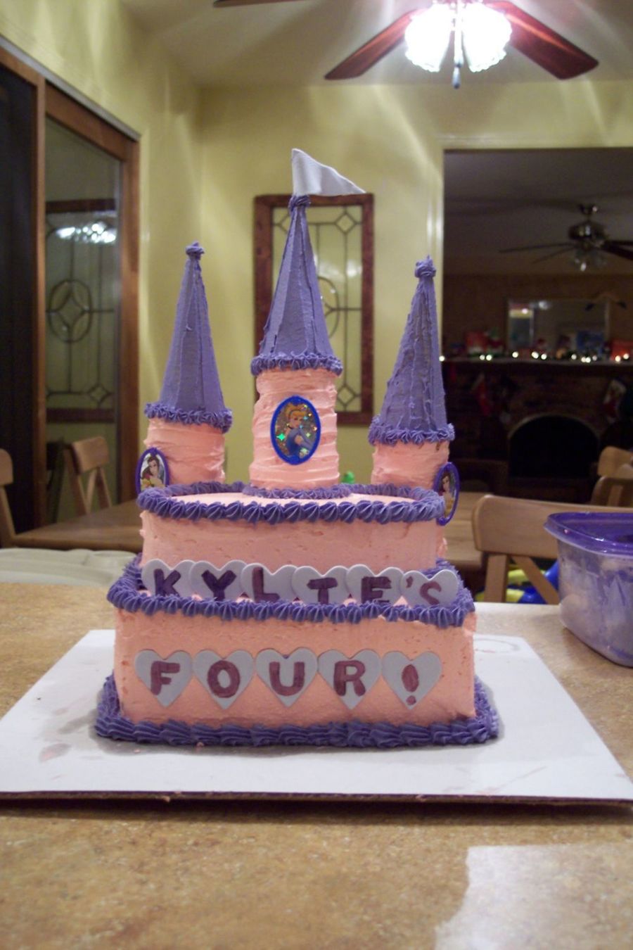 My neice is crazy about Disney princesses so I decided to make her a castle cake for her 4th birthday. Her mom's reaction was as priceless as hers! I used two 10"squares, one 9" oval and used a cutter to make circles which I stacked for the towers. The tower roofs are sugar cones coated in buttercream icing. The letters are sugarpaste hearts which I just painted on using food paste and a little icing gel