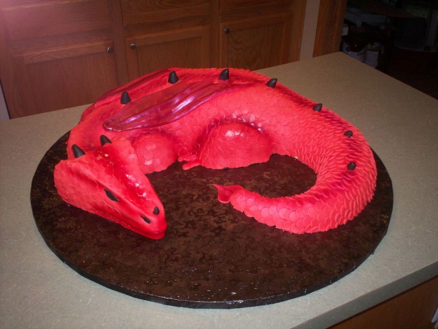White cake iced in buttercream dream, covered in individual hand cut fondant scales, airbrushed with cranberry luster dust. Board dragon is sitting on is 24in across, to give an idea of how large the dragon was Thanks for looking!