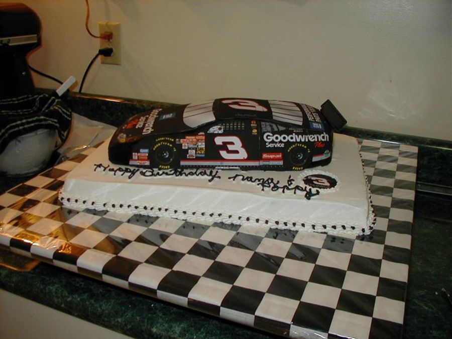 My mother's birthday is the 28th, Step-father's is the 27th. My husband and I bought them Nascar tickets for the October race, so I thought it fitting I make them a Nascar cake. Black fondant, edible images, white almond cake, and white almond & strawberry marbled cake. Buttercream icing.