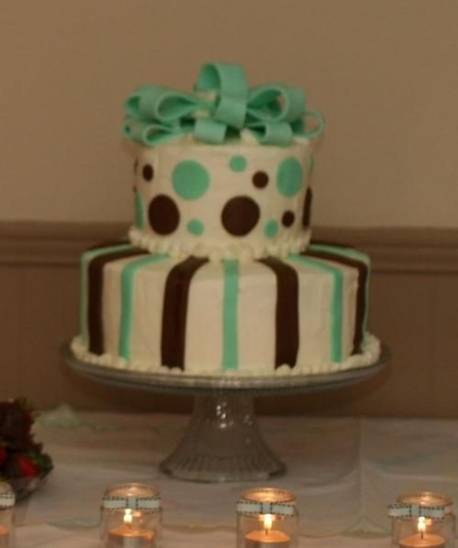This is my first stacked cake. It was for my sister's baby shower. The cake is wilton's classic white cake frosted with wilton's buttercream icing and fondant decorations. The bow was awful and the cake turned out DRY! But my icing tasted good and was SMMOOOTH!