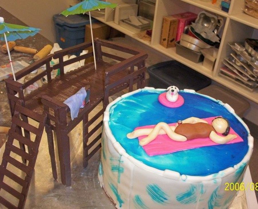 Next door neighbor turned 50 last summer, has pool in backyard, my DH built her deck and she has a white poodle, I recreated her/murphy(who has his own raft)and pool. Chocolate, BC with fondant accents and piping gel water(MAJOR leakage later) other neighbor built mini deck, also did towel and flip flops. A huge hit. ON any given day I can find her asleep on her raft.