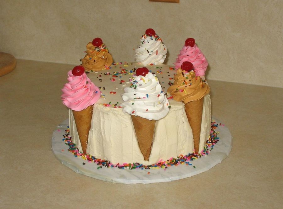 Just for me ;-) 9" 2-layer amaretto butter cake w/vanilla pudding filling. I actually like it better when I ice icing smooth - I did not do the patterend sides well.. Iced in BC. Whipped icing for the ice cream. Sugar cones trimmed to fit. Real cherries & spinkles. Inspired by a cake by cupcakequeen.