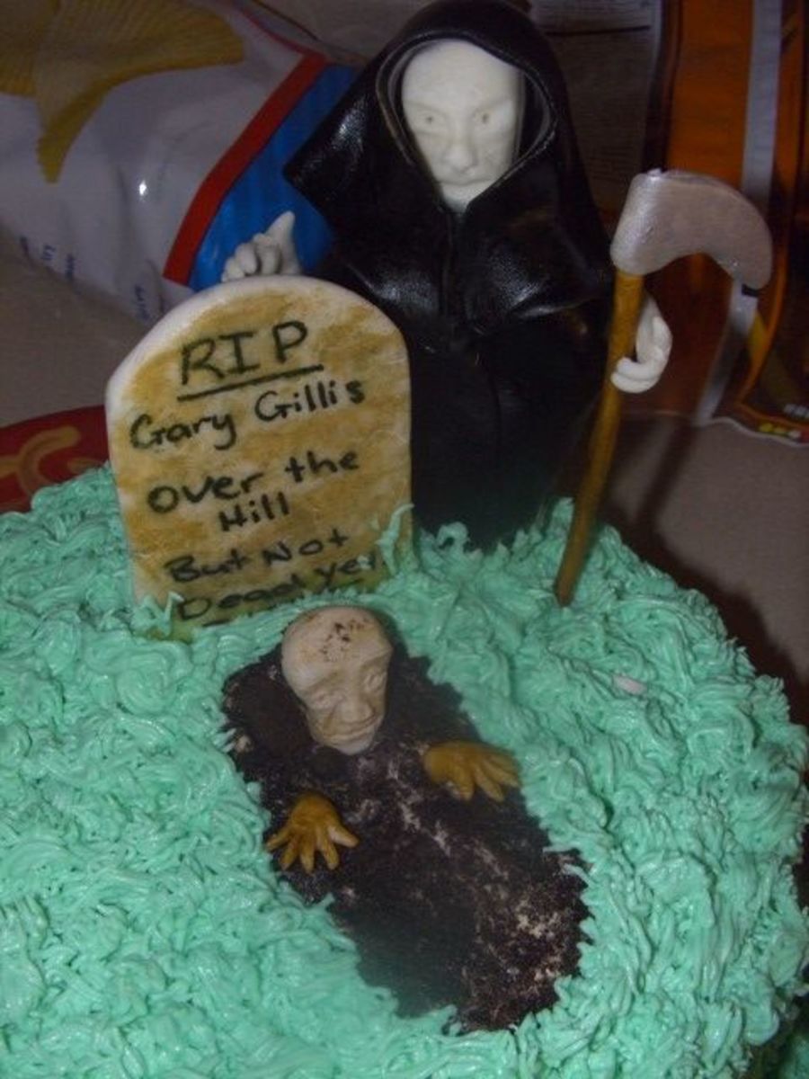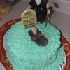 This is a cake I did for Hubbys b-day today, I wanted to do an over the hill cake but didnt want to do the head stone shaped cake evreyone else, does..I like them but just wanted something just for him...This is meant to be hubby trying to get out of the grave cause he is over the hill but not dead yet..As the head stone reads.....With the grim reaper looking over him trying to get him as he is getting older.....
