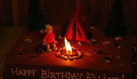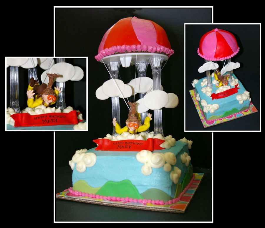 I made this for a friend's mother who had taken her first skydiving trip just before her 59th birthday. I just had this "vision" of what I wanted and was so happy to pull it off - she is actually suspended in the air! I made a photo collage because there wasn't really one good angle to show everything. Cakes are lemon with cream cheese frosting and fondant accents.