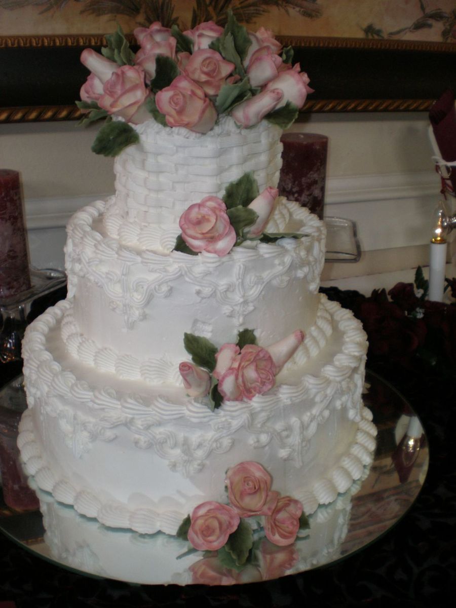 This was a white cake with Raspberry filling.....marshmallow cream icing with gumpaste Roses. This was my first wedding cake.