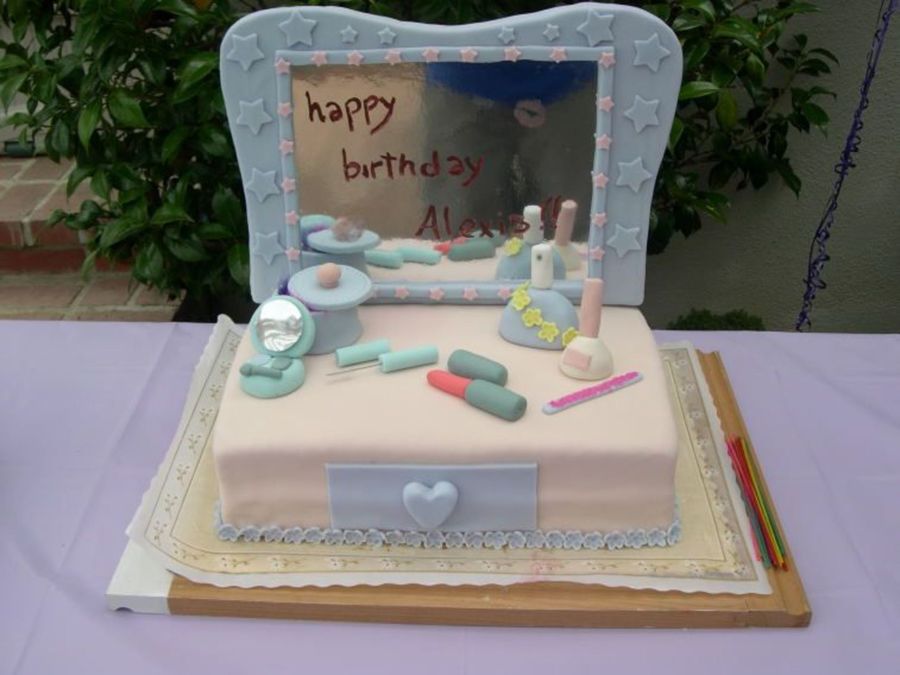 Cake for my niece's birthday. She was having a Diva's party. The cake is covered in fondant and for the mirror I cut the shape on laminated styrofoam, then I glued that silver shinny cardboard (I got both things at the art store) and then covered it with fondant. To stand it up I inserted 5 skewer sticks halfway along the styrofoam and used that to pin it to the cake.