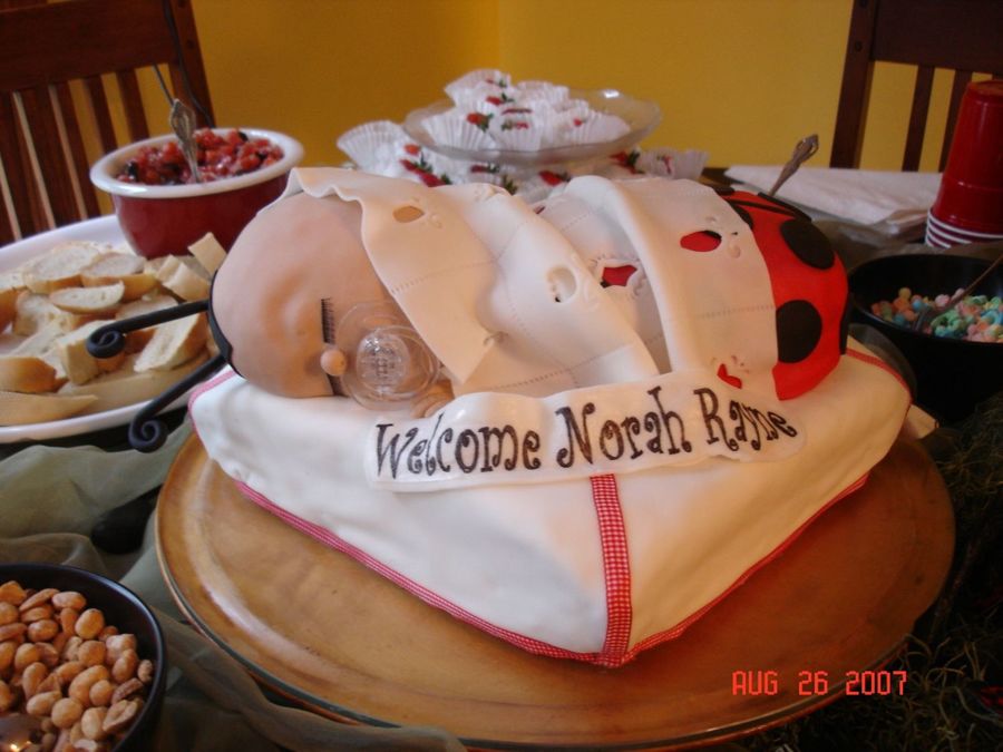 Thank you all for your wonderful comments. The babie's (ladybug) body is cake and the head I hand shaped rice krispie treats. It matched the babie's room, lady bugs and Anne Geddes pictures. Again thanks for looking!
