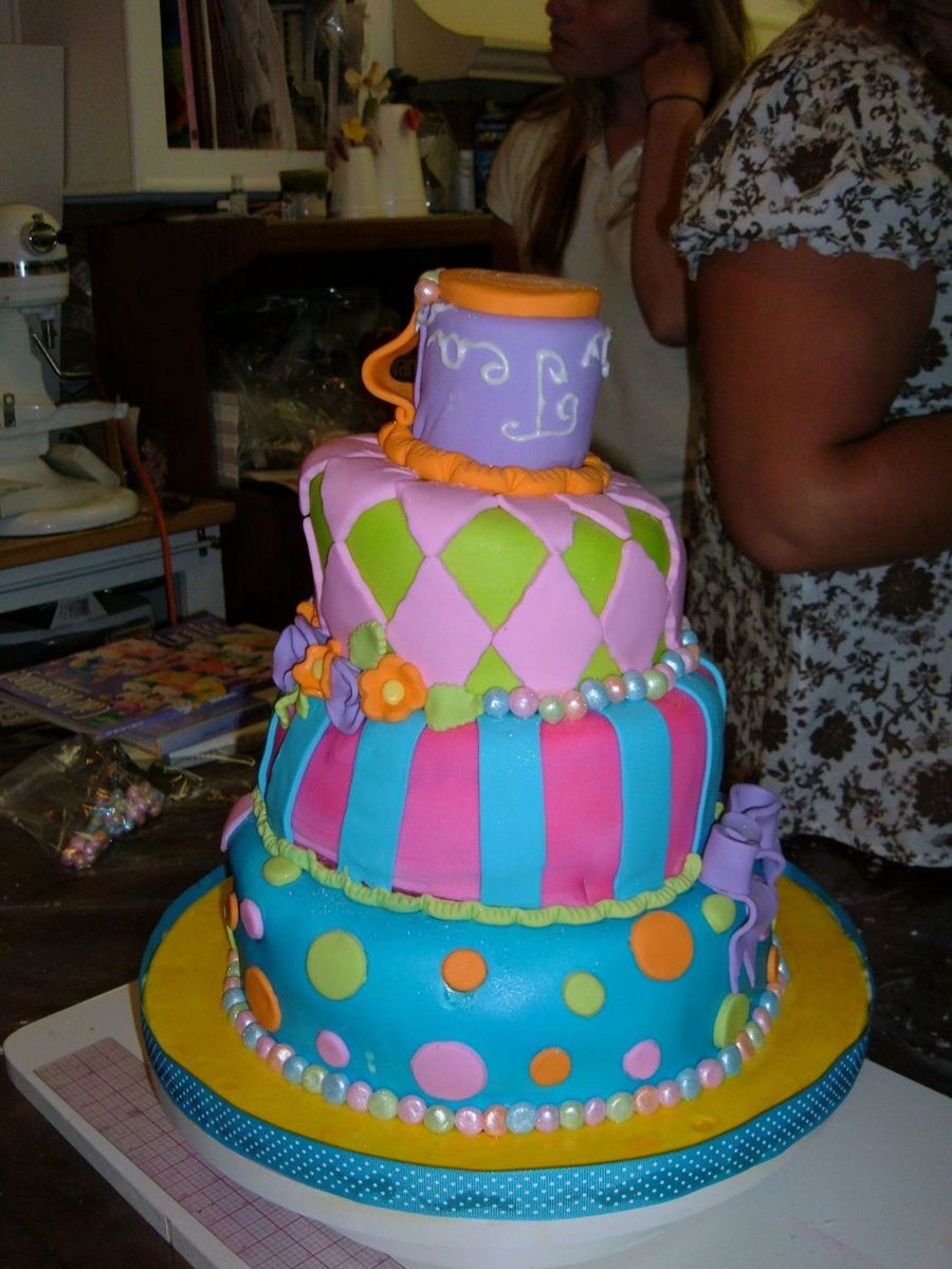This cake was for a Mad Hatter themed tea party bridal shower. I agreed to help some friends with it. They came over with the cakes already baked. It took 5 of us 5 hours to stack and decorate the cake. Everything is covered in fondant and all electric colors are used. The top tier is an upside down tea cup to complete the theme.