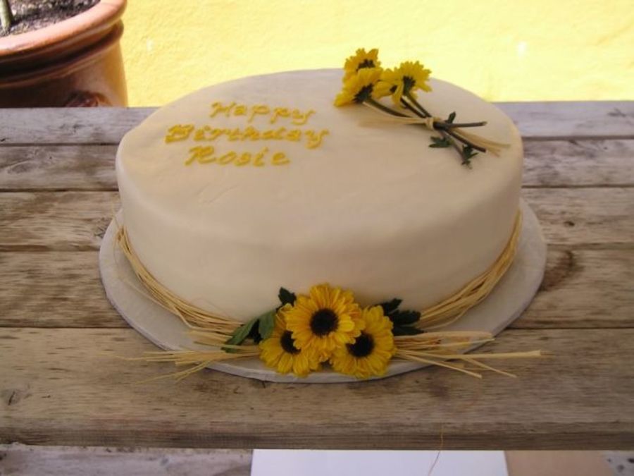 I finally got a chance to use LorAnn's Princess cake flavoring on this 12" round. Yummy! Buttercream filling with fresh sliced strawberries on top of that, then covered in fondant. I used real raffia tied around the base and some fresh mini sunflowers. The fondant started to bubble after sitting outside in the heat for a while. I can't imagine having used buttercream!
