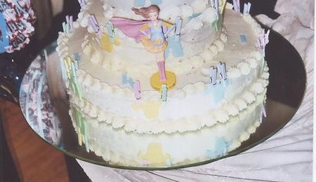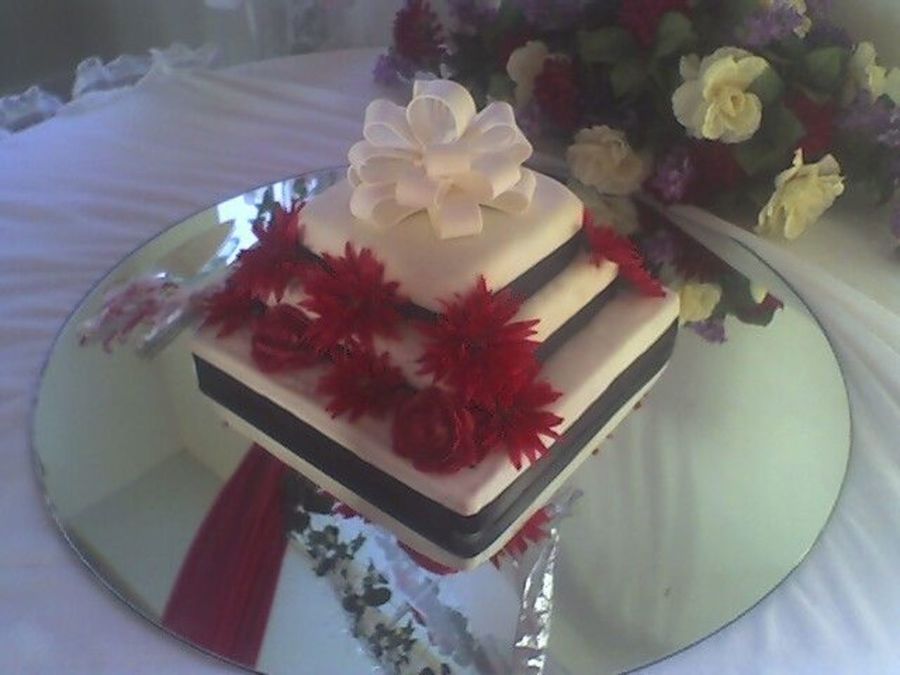 THIS IS A WEDDING CAKE! TOP LAYER CAKE STRAWBERRY..AND CHOCOLOATE AND THE REST IS VANILLA. I USED FONDAT INSTEADOF FROSTING AND SILKFLOWERS