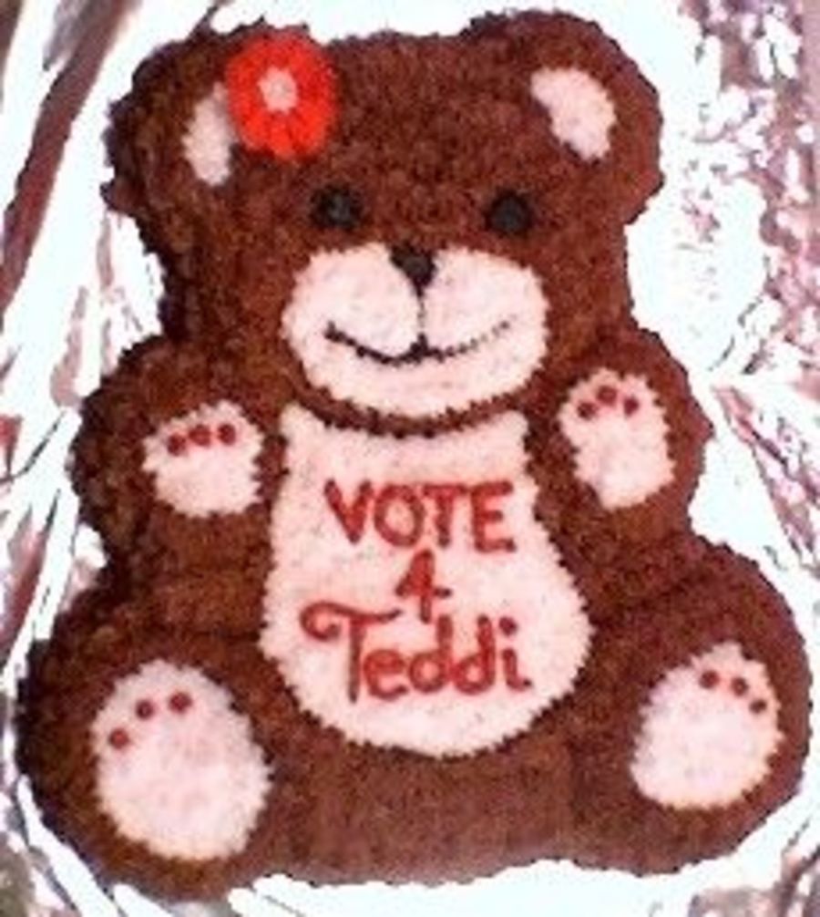 This chocolate cake was done for a young lady running for class president, who's nickname was "Teddy". The tummy is buttercream and the body is milk chocolate icing.
