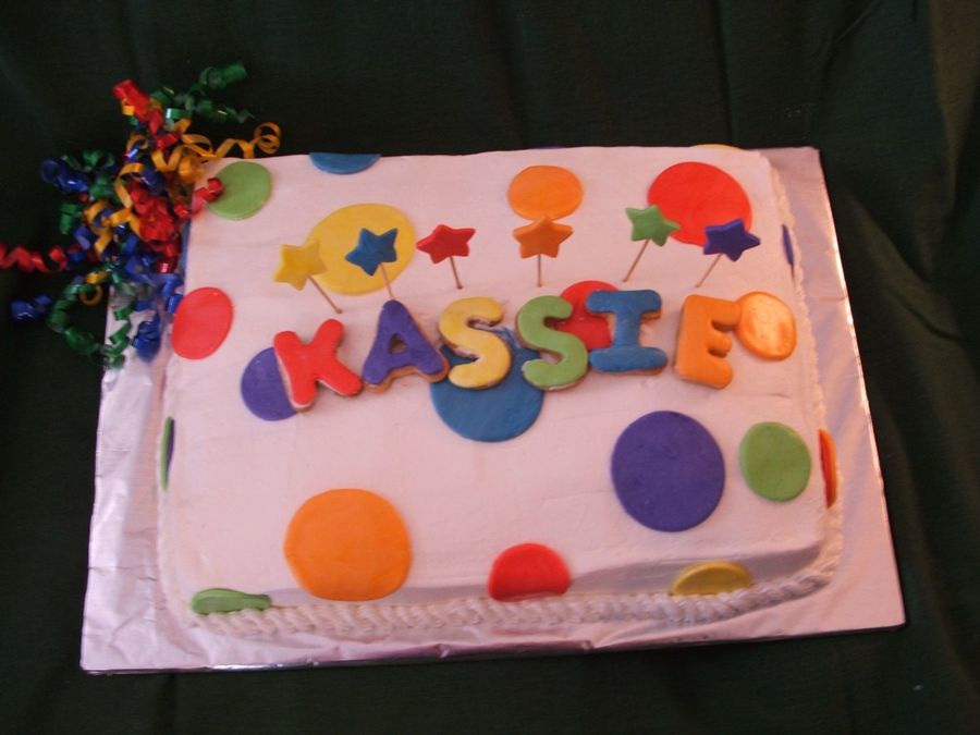 What a festive cake! Nicely done! The name looks like it's made of cookies - nice touch. Nice rope border too!