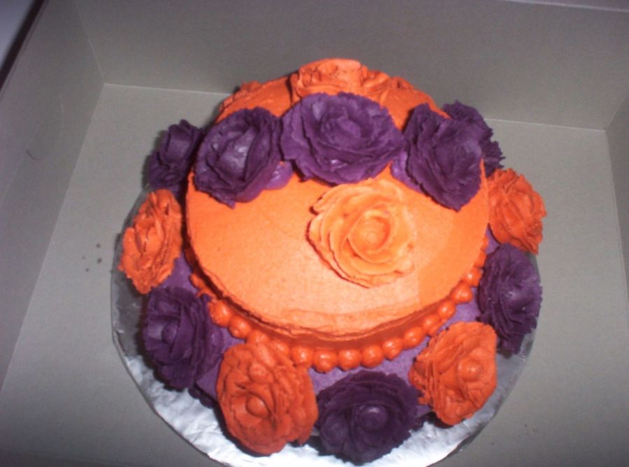 this was for an anniversary their colors were eggplant and burnt orange and it really did come out those colors but in the picture it looks halloween orange and puke purple. The roses were put on right away but dried out and flaked off the edges of the roses which was frustrating.