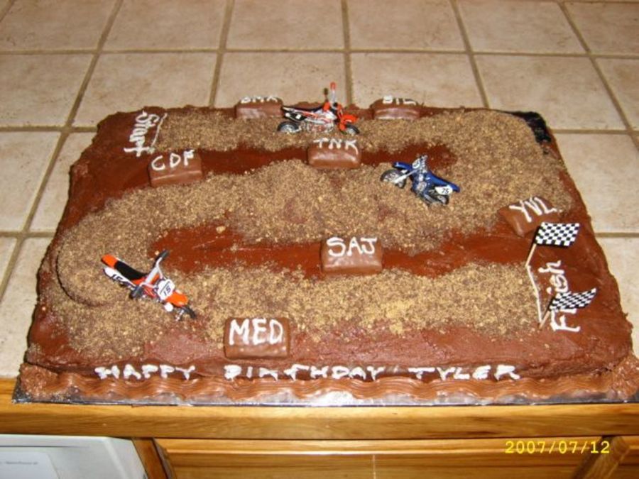 Chocolate cake with chocolate b/c frosting. Track is made out of chocolate and regular graham cracker's; crushed. Bumpers around track are small candy bars.