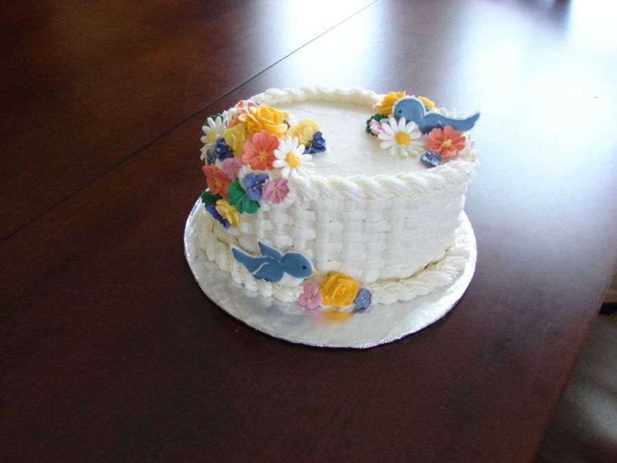 Buttercream basketweave, colorflow blue birds, and royal icing flowers.
