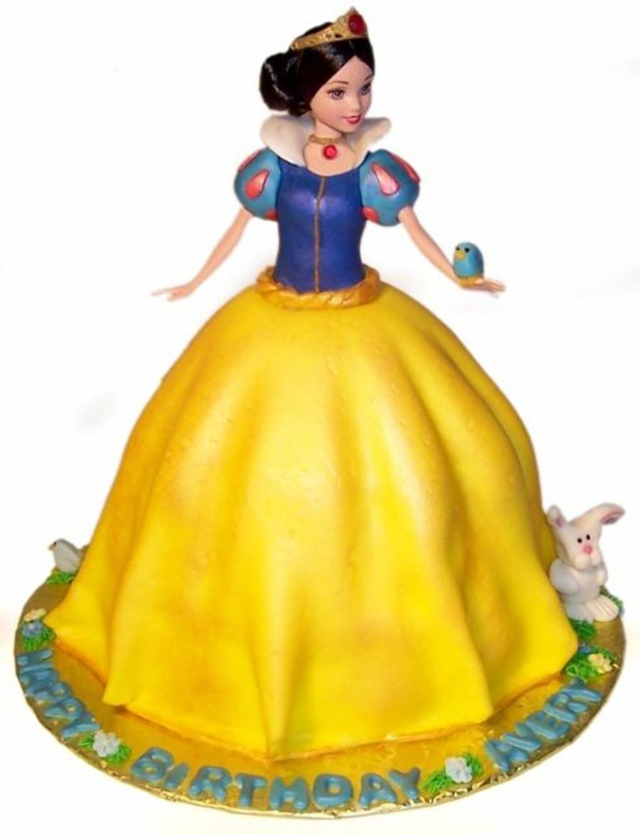 This was a real Snow White Barbie put in the wondermold and 9" pan. All covered in fondant, her skirt was dry dusted with luster dust, and the top painted. Fondant letter cut-outs, RI flowers, and fondant modeled birds, and bunny. This cake was lots of fun to make!