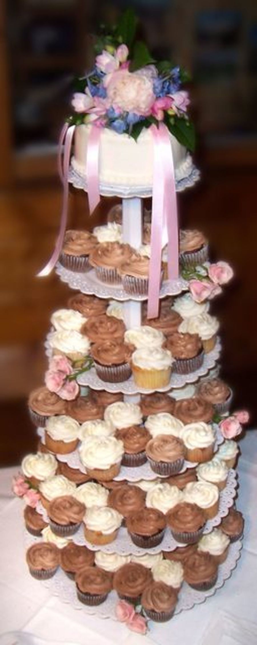 This was my first wedding cupcakes. YASC cupcakes with ivory swirled buttercream, and CASC cupcakes with chocolate swirled buttercream, a CASC 6" cake on top for cutting. The wedding topper was supplied by the bride and was way too big.
