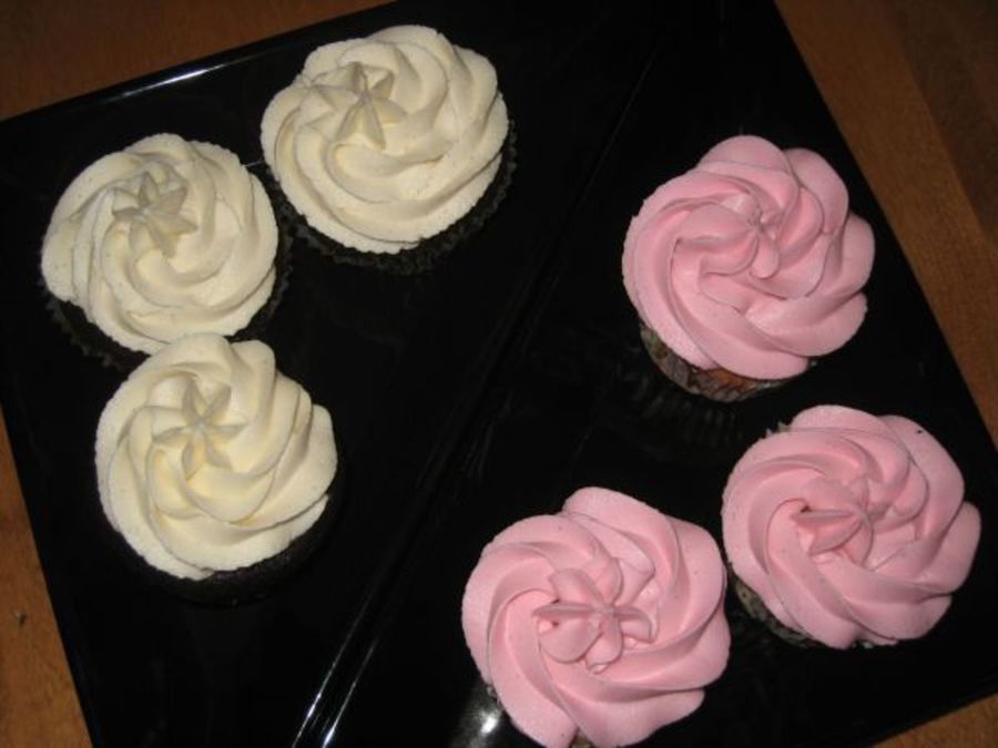 Double chocolate cake with cupcake filling (recipe taken off CC - Melivra's recipe - YUM!) with BC Dream swirl (make with real vanilla paste) White chocolate cake with strawberry mousse filling with pink BC Dream swirl. They were a hit!