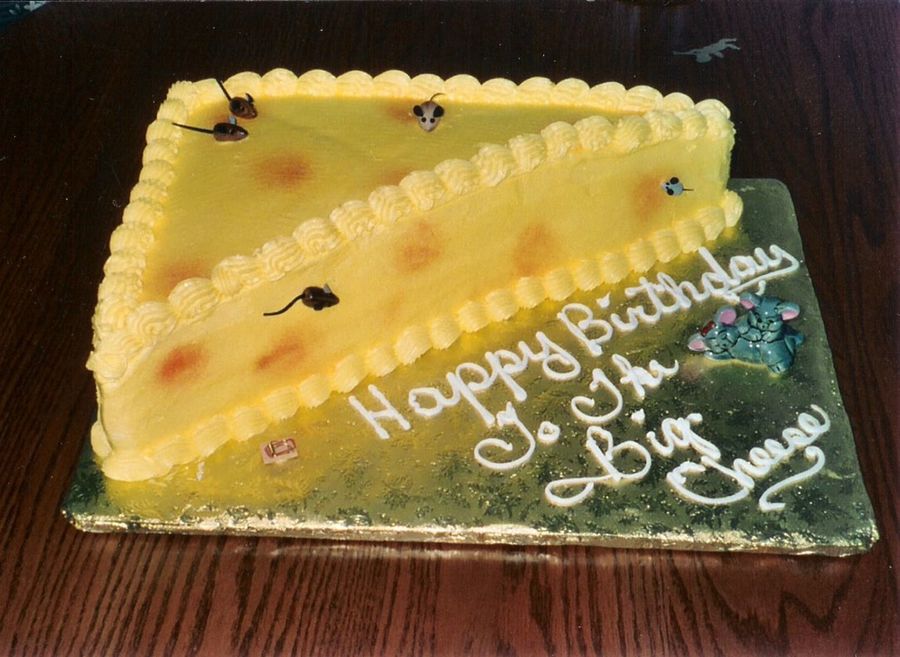I baked a 9 x 13 cake cut it at an angle and double layered the cake. I iced the cake with b/c. Sprayed round brown circles on the top and the saids of the cake. Placed a small mouse trap on the board and placed mice on the top and the sides of the cake. Since I was the Office Administrator for the Mayor of Pontoon I wrote to the big cheese, since he was. The cake was chocolate his favorite.