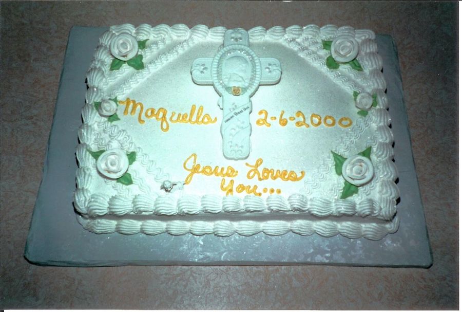 Thank you CakesOnly, the cross was bought at a bible store my daughter wanted Maquella to have something that she could keep and I was glad due to the fact my wrist was bad and I could hardly ice the cake, as you can tell from the writing.
