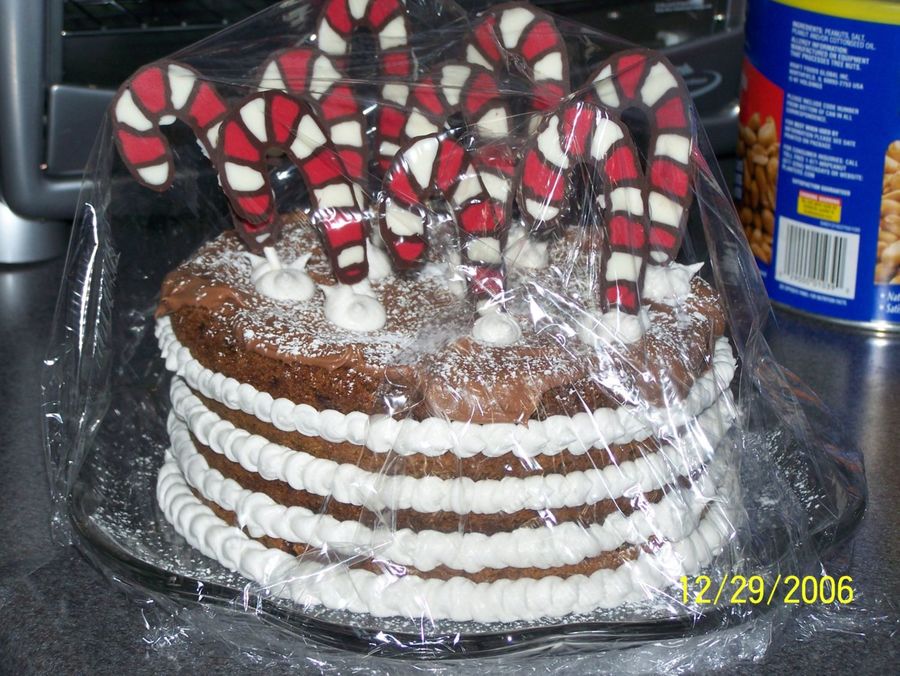 This is a cake that I made for New Years Eve. It is 4 8in chocolate chip cookies with chocolate buttercream frosting. The candy canes are made out of candy melts.