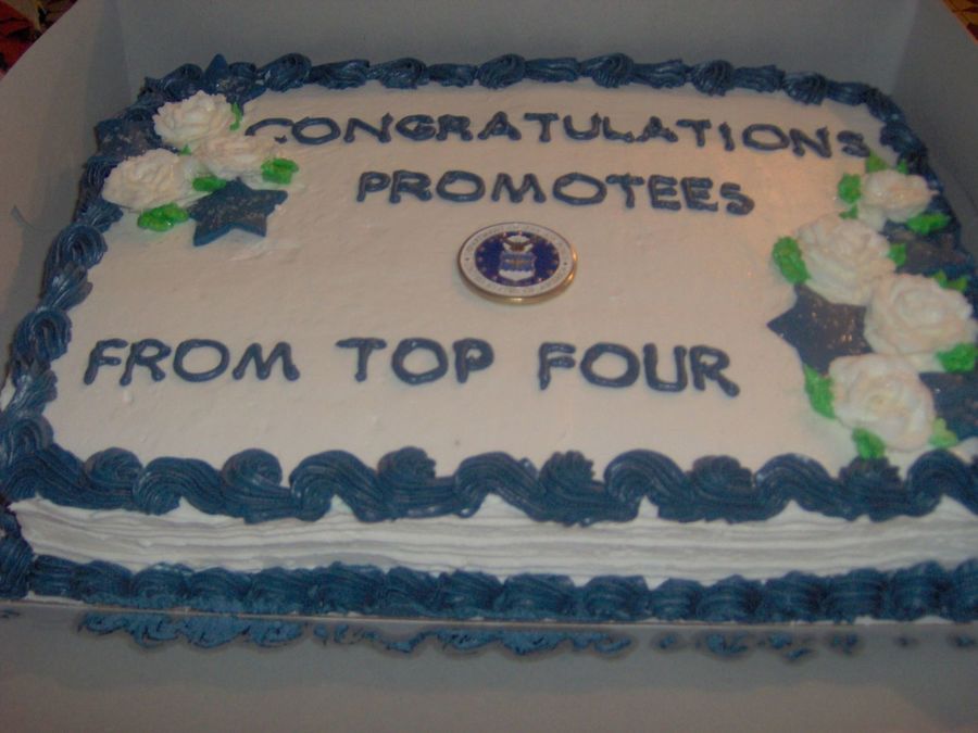 This is a promotion cake I made for the guys at work who made the next rank (Air Force). Plain white cake with white wondercream frosting. Still working on my roses, though. This was also my first time attempting a reverse shell boarder (on top only) and making colored stars out of white fondant. All in all, I was really pleased with the way it came out, especially since I've only been doing this for a few months and really have no idea what or how to do anything! HAHA Anyone have any tips that might help??
