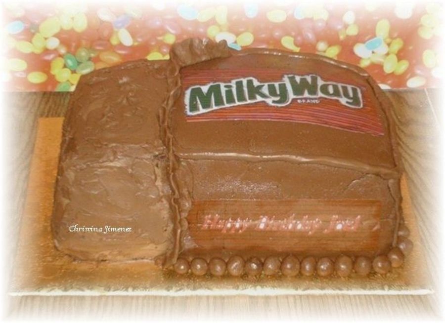 This is my husband's birthday cake for today. He loves chocolate and candy bars. First time making chocolate fondant with not very good results :- ( Chocolate cake with chocolate mousse filling and caramel filling. Iced in chocolate ganache and covered with chocolate fondant. Edible image for the Milky Way logo. Inspiration from peacockplace Snickers Cake, many thanks!